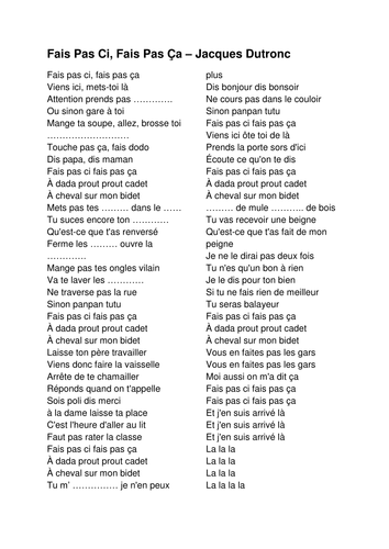 A dada prout prout cadet a cheval sur mon bidet laisse ton père travailler viens donc faire la vaisselle arrête de t chamailler réponds quand on t appelle sois poli dis merci a la dame laisse ta place c est l heure d aller au lit faut pas rater la classe fais pas ci fais pas ça a dada prout prout cadet a cheval sur mon bidet. En chantant à dada sur mon bidet elle s est évaporée but at the corner of a street this little girl disapeared after she went to the backery and bought some candies. 1f30bfq1jf n3r çà àiutrq dfgui765rezaz45678909876542123456789009875432345é è ç. Retrouvez les paroles de les mômes du ce2 a dada sur mon bidet lyrics.